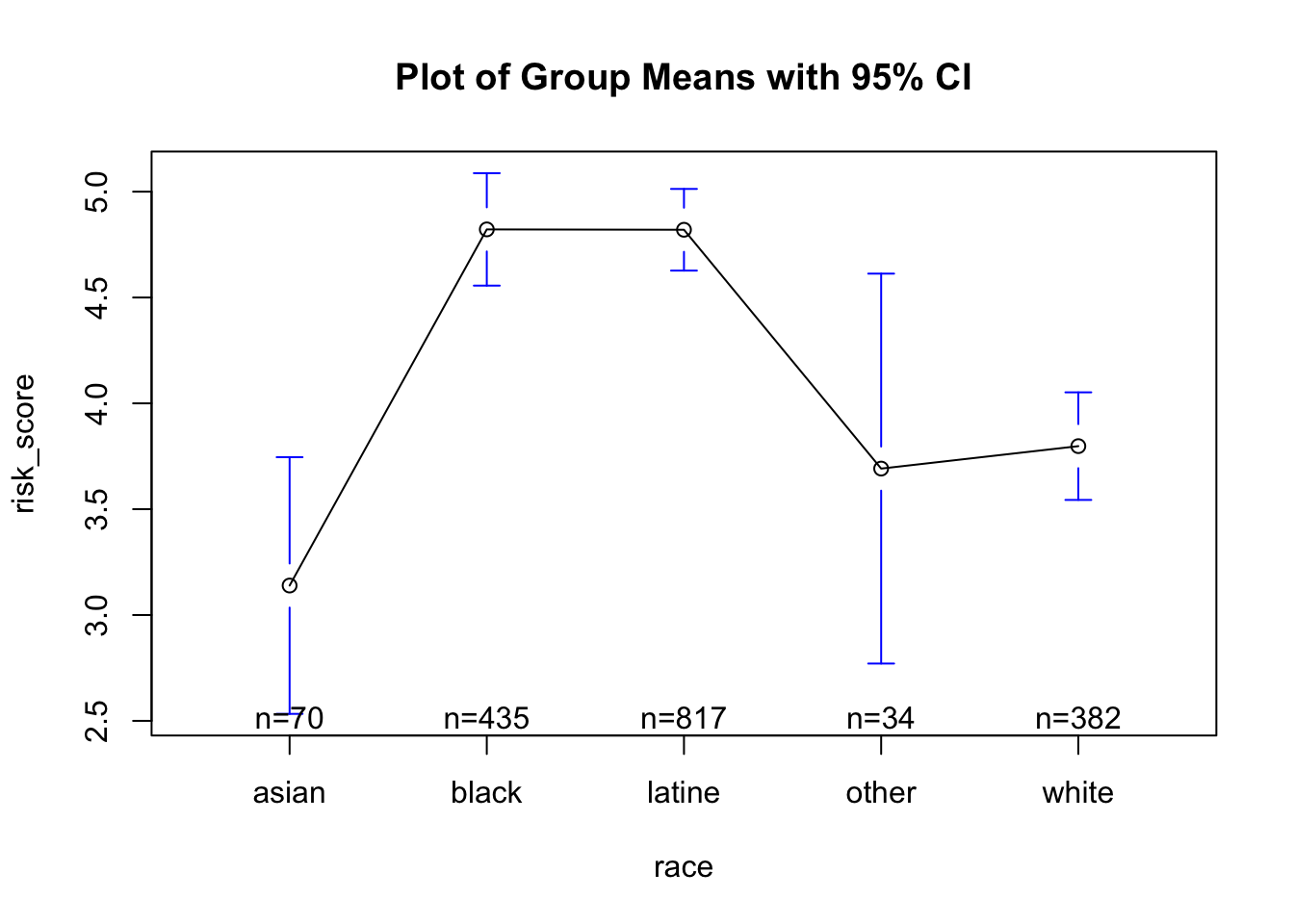 ## ow.anova(df = data1, var1 = risk_score, by1 = race, plot = T,