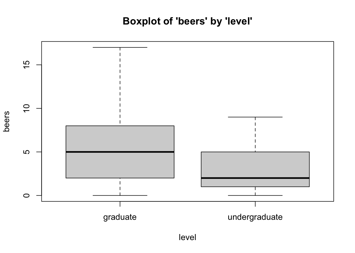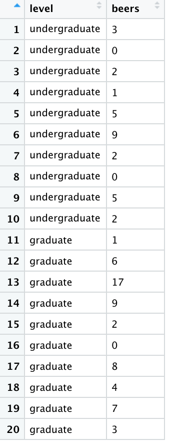 beers <- c(3, 0, 2, 1, 5, 9, 2, 0, 5, 2, 1, 6, 17, 9, 2, 0, 8, 4, 7, 3)Where the first observation in level (student type) corresponds with