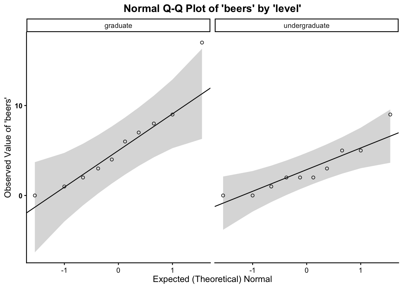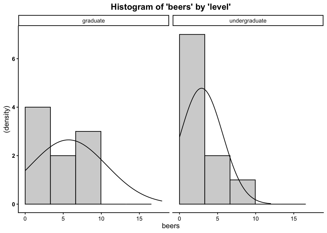 we have met the assumption for homogeneity of variance.Plot the histogram for beers (Y variable) broken out by student type (levels of the X variable), overlaying a normal curve…