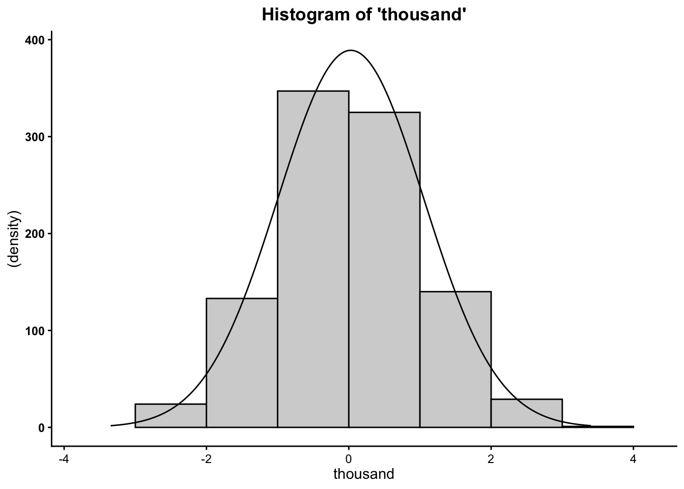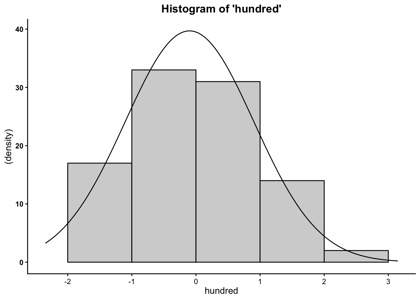 Statisticians have developed a kurtosis measure that represents excess kurtosis beyond the normal curve (although typical kurtosis ranges from 1 to \(+ \infty\)). This excess kurtosis measure ranges from \(-2\) to \(+ \infty\). Using this metric, negative values represent platykurtic distributions and positive values indicate leptokurtic distributions. Distributions close to a kurtosis value of 0 are considered mesokurtic. We use cutoffs to indicate types of kurtosis, as follows…